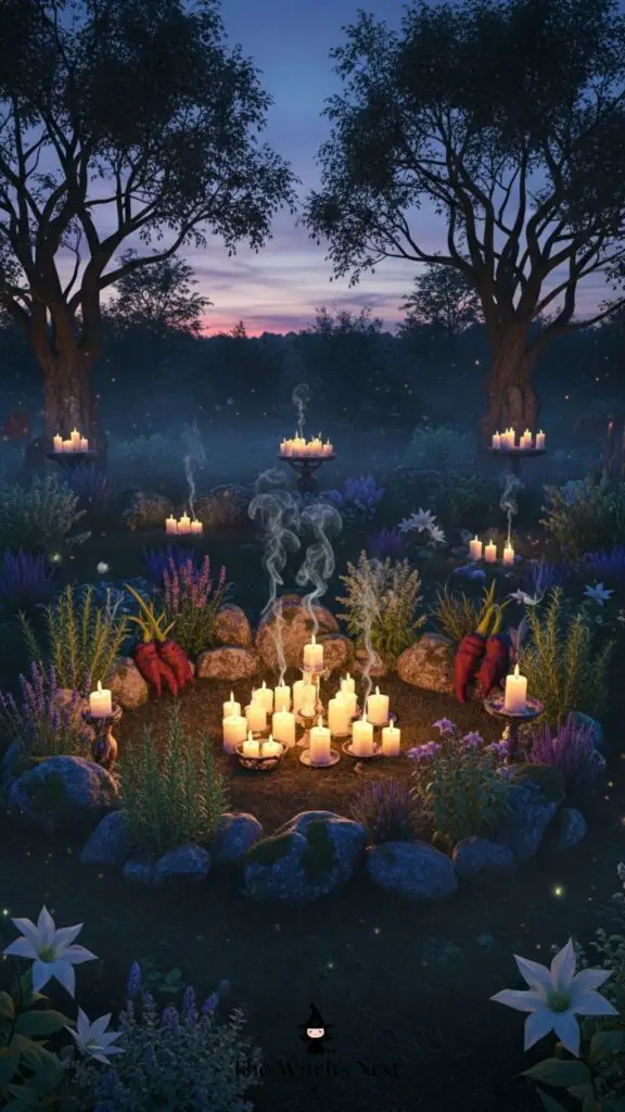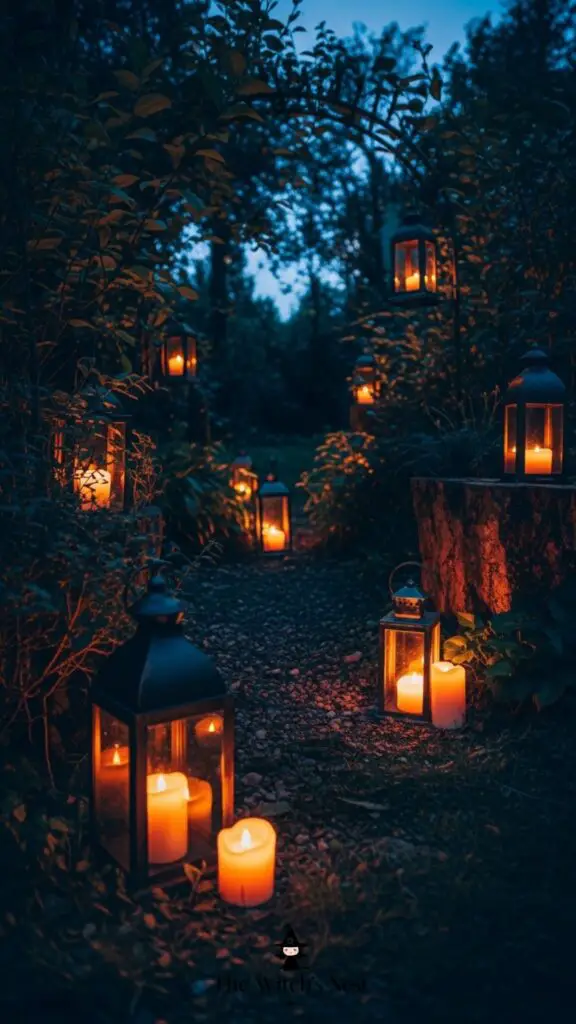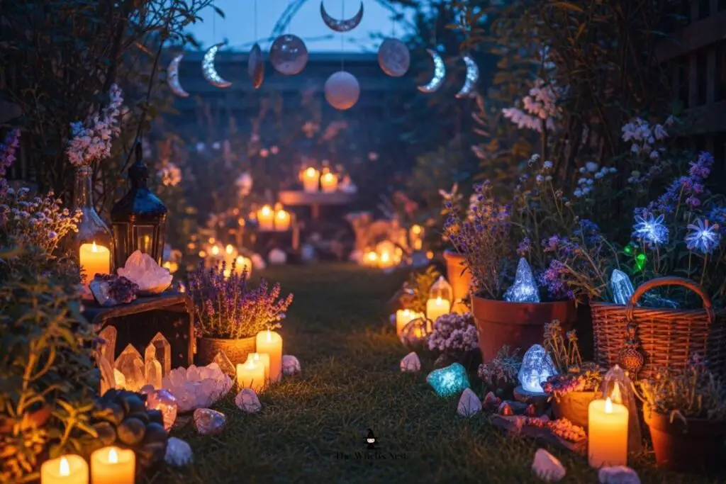A witchy garden shines brightest at night. Place candles, lanterns, or fairy lights to create a mystical glow. Use black or deep red candles for protection, white for purity, and green for abundance. Candlelit evenings in the garden make the perfect setting for rituals or meditation.