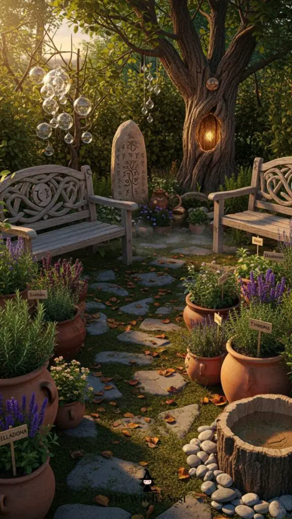 Avoid plastic or artificial decor; instead, choose wood, stone, clay, or metal. A rustic wooden bench, stone pathways, clay pots, and wrought iron garden arches all add to the authentic witchy feel. Natural textures keep the energy grounded and connected to the earth.
