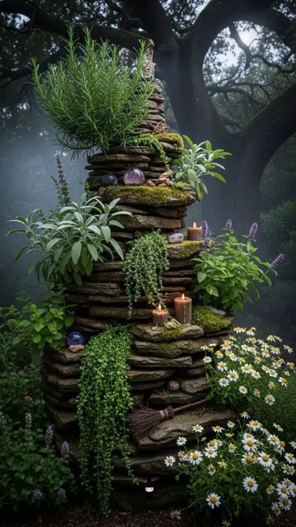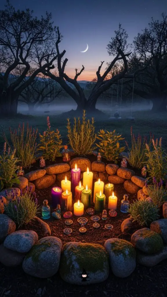Arrange plants or stones in a circle formation to create a sacred space for rituals. Circles represent protection and unity, making them perfect for casting spells, meditating, or simply connecting with nature. Surround the circle with herbs and flowers to reinforce its magical boundary.