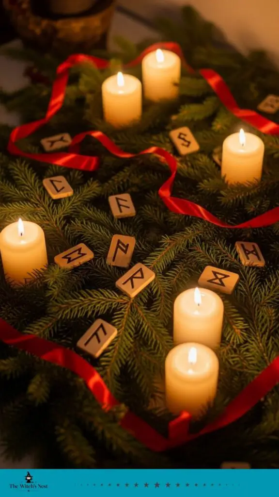 Bring the forest indoors with an altar draped in fresh pine, cedar, and holly branches. Adorn it with pinecones dusted in glittering gold, red ribbons, and carved wooden runes. Place candles in shades of green and red, symbolizing life and vitality. Every time you pass by, you’ll feel as though the heart of the forest is alive in your home.