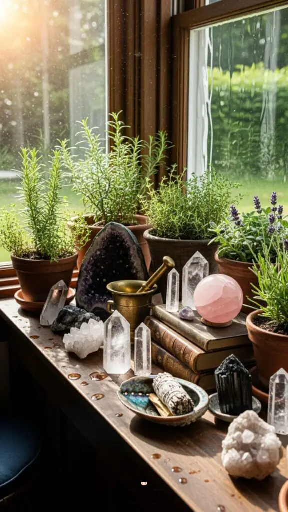 Line your windowsill with potted herbs like rosemary, basil, and lavender. Add a small quartz cluster for extra charm and healing energy.