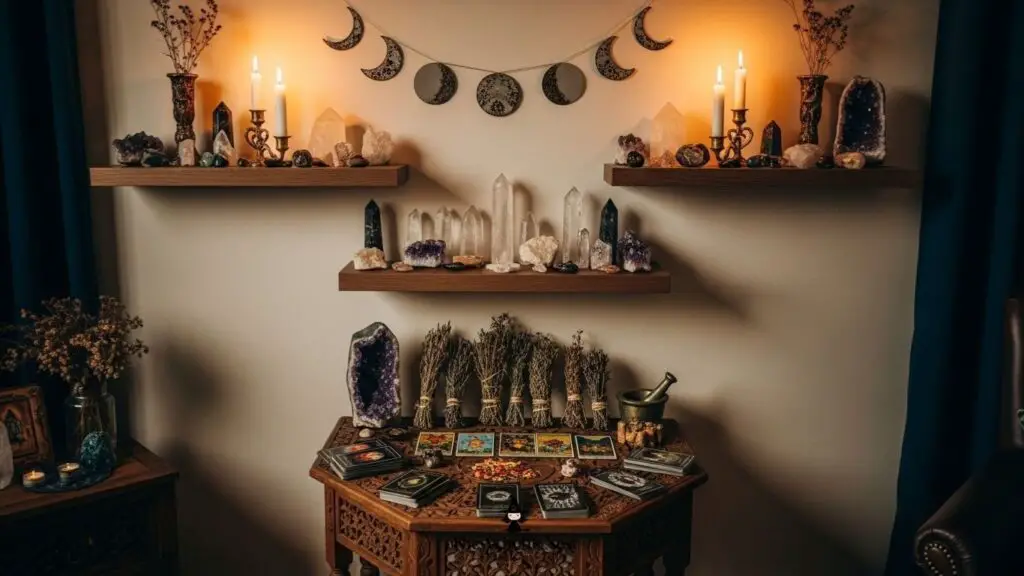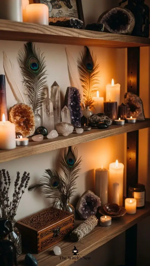 Transform a small wall with floating wooden shelves filled with crystals, feathers, and candles. It’s a simple way to create a magical focal point.
