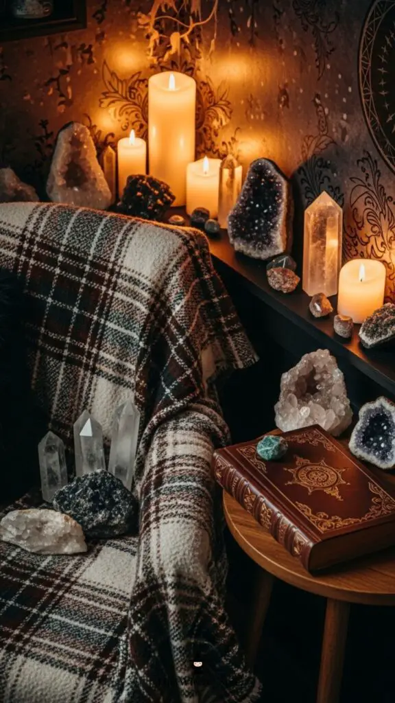 Place a comfortable chair with a plaid throw and a side table stacked with candles and a crystal lamp. Perfect for witchy reading or journaling.