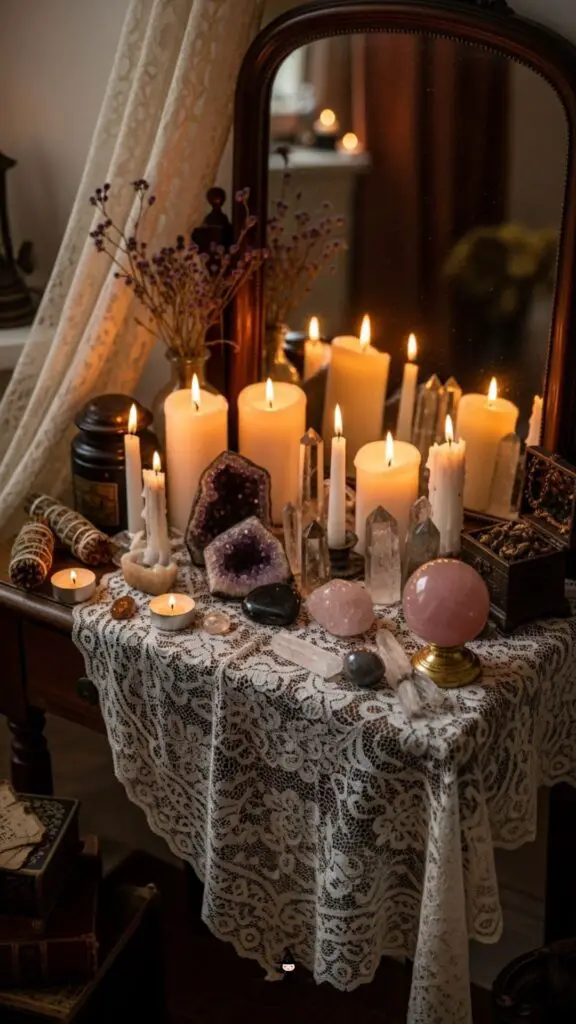 Set up a small round table with a lace cloth, antique candleholders, and a bowl of crystals. Add a mirror for a vintage witchy touch.