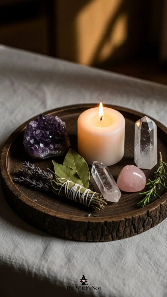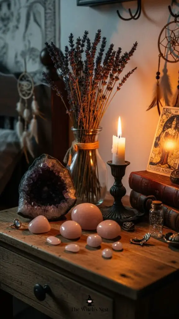 Place amethyst or rose quartz on your nightstand with a small candle and dried lavender. It creates a dreamy, protective witchy corner.