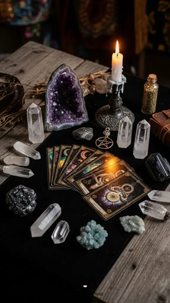 Dedicate a small side table for tarot or oracle cards. Add crystals, a candle, and a silk cloth for an elegant witchy reading space.