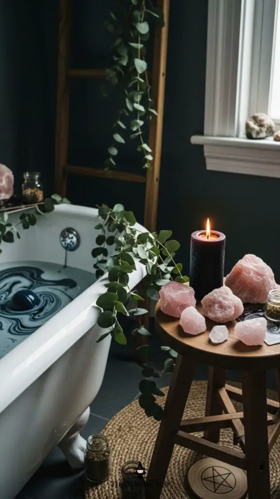 Add eucalyptus bundles, rose quartz by the tub, and a black candle to your bathroom corner. It becomes a sanctuary for self-care and ritual.