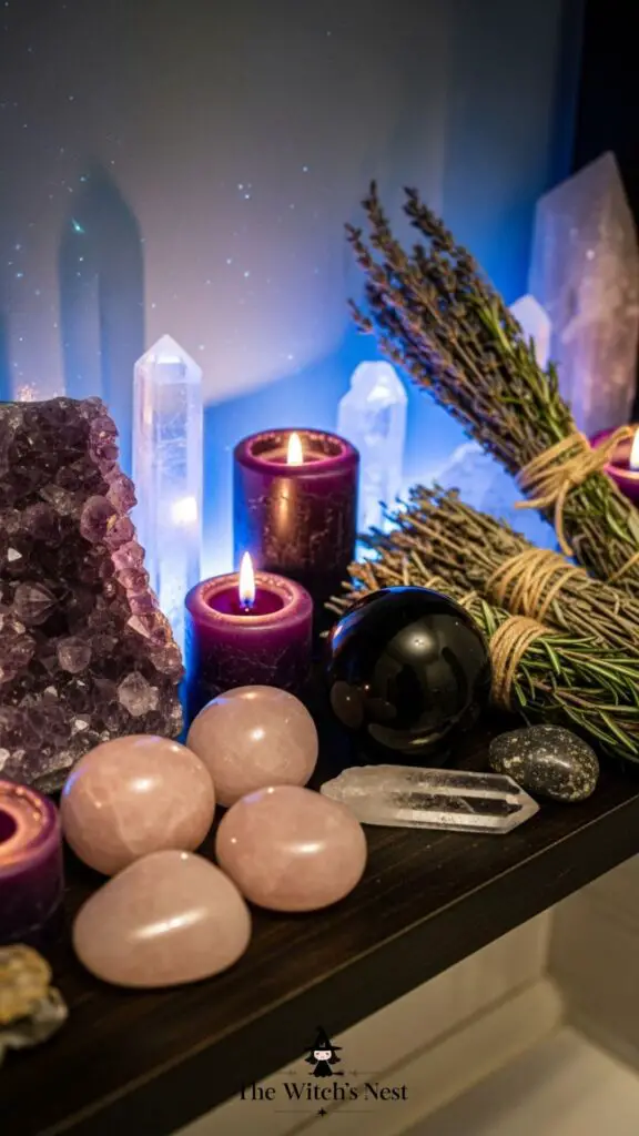 Incorporate crystals like amethyst (peace), obsidian (protection), rose quartz (love), and clear quartz (clarity). Place them on shelves, windowsills, or near your mirror to infuse the space with magical energy.
