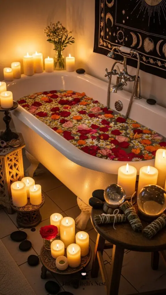 A witchy bath wouldn’t be complete without flower petals or herbal infusions. Rose petals for love, chamomile for calm, and calendula for beauty can turn your bath into a true ritual of enchantment.