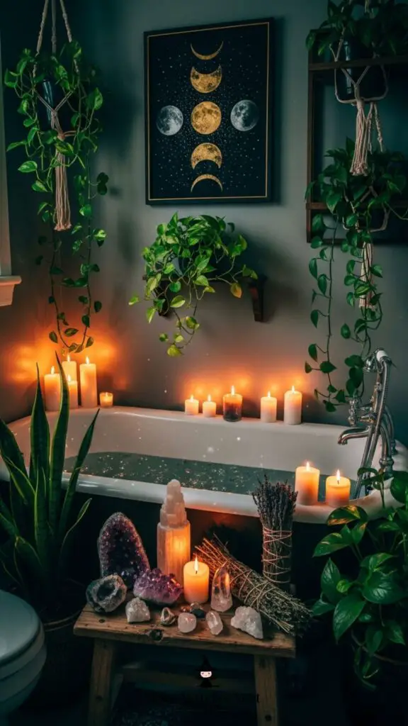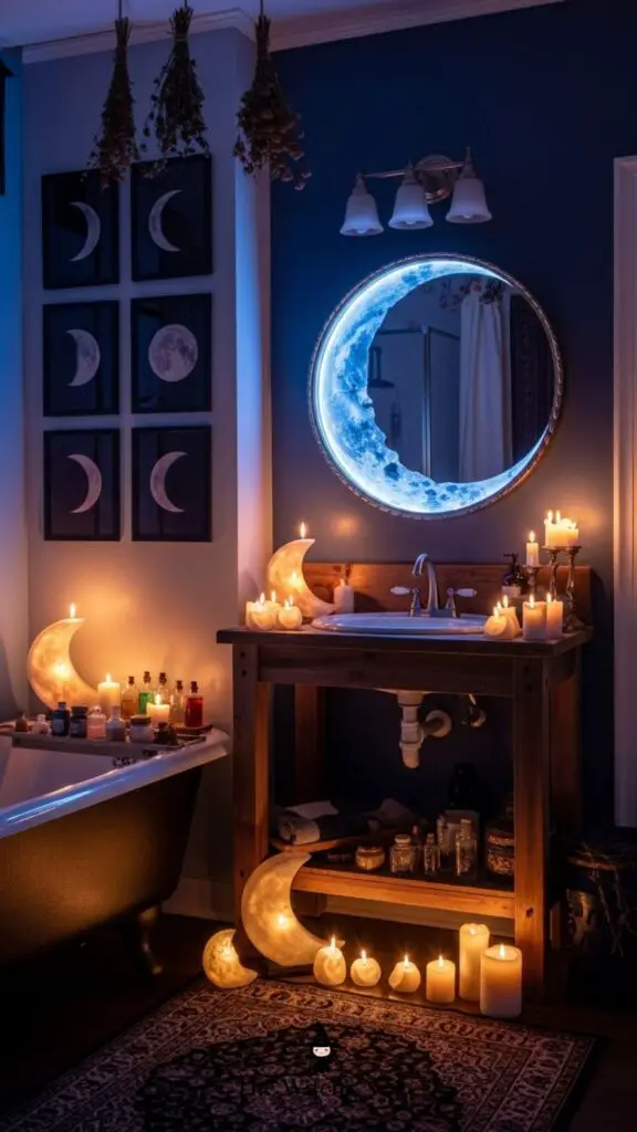 Bring lunar energy into your bathroom with moon phase wall art, crescent moon mirrors, or moon-shaped candles. The moon’s presence enhances the magical vibe of your space.