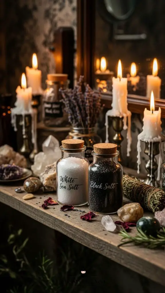 Keep a small jar of sea salt or black salt on your counter or shelves. Add it to baths for grounding or sprinkle around the room for protection. It’s a simple yet powerful witchy touch.