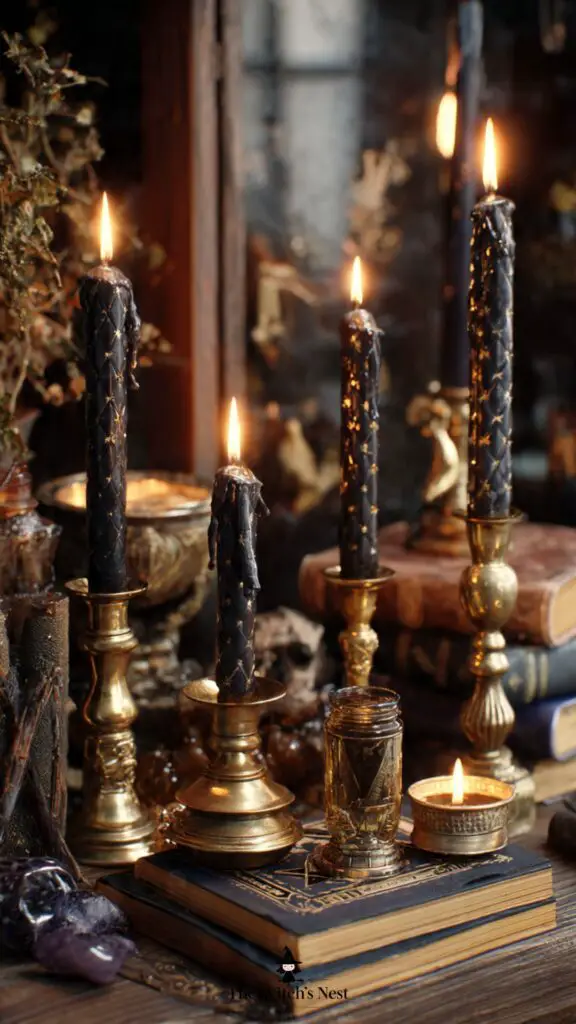 For an elegant altar, use tall black and gold candles in vintage brass holders. These colors bring power, protection, and mystery.