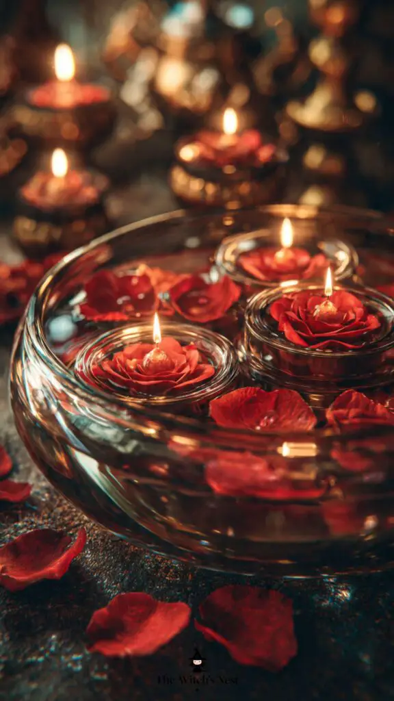 Fill a glass bowl with water and float tea light candles inside. Add rose petals or herbs for a witchy, enchanted touch.