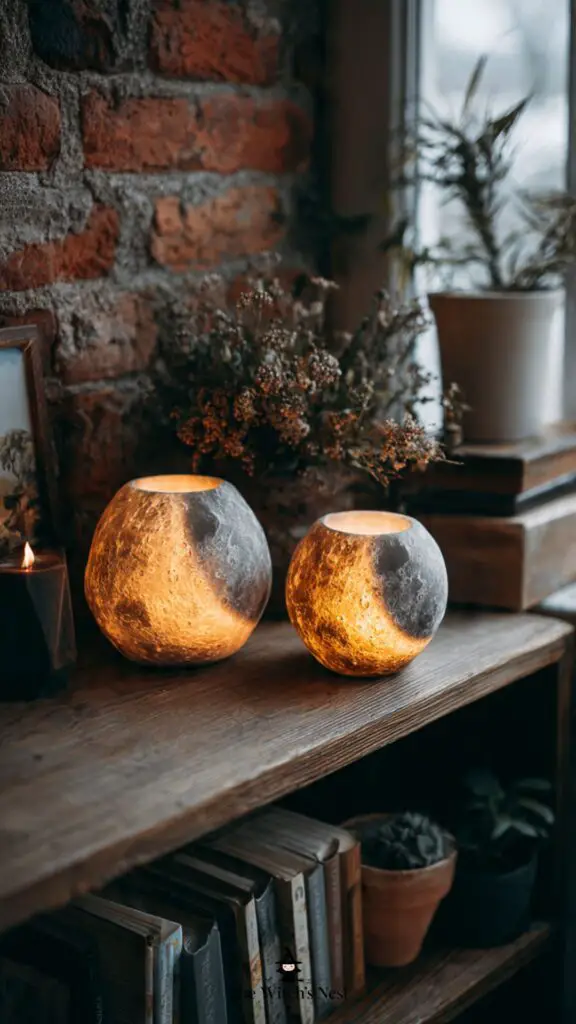 Use candle holders shaped like the moon phases for a celestial vibe. Arrange them on shelves, mantels, or coffee tables.