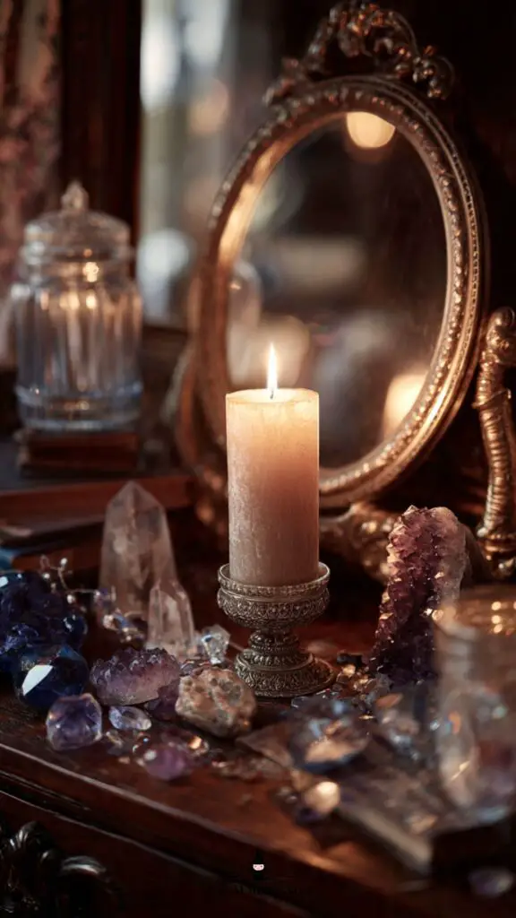 Place candles in front of a mirror to double the glow. Add crystals around for a sparkling, magical display.