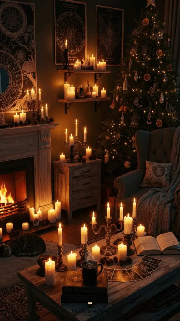 Dedicate a corner of your living room to a holiday altar. Decorate with holly, mistletoe, candles, and a cauldron filled with pinecones or fairy lights.