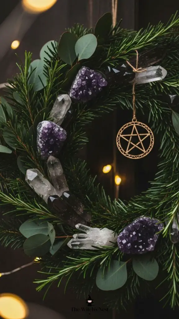 Hang a wreath made of pine, rosemary, and eucalyptus. Add ribbons in dark tones, a pentacle charm, or crystals woven into the greenery.