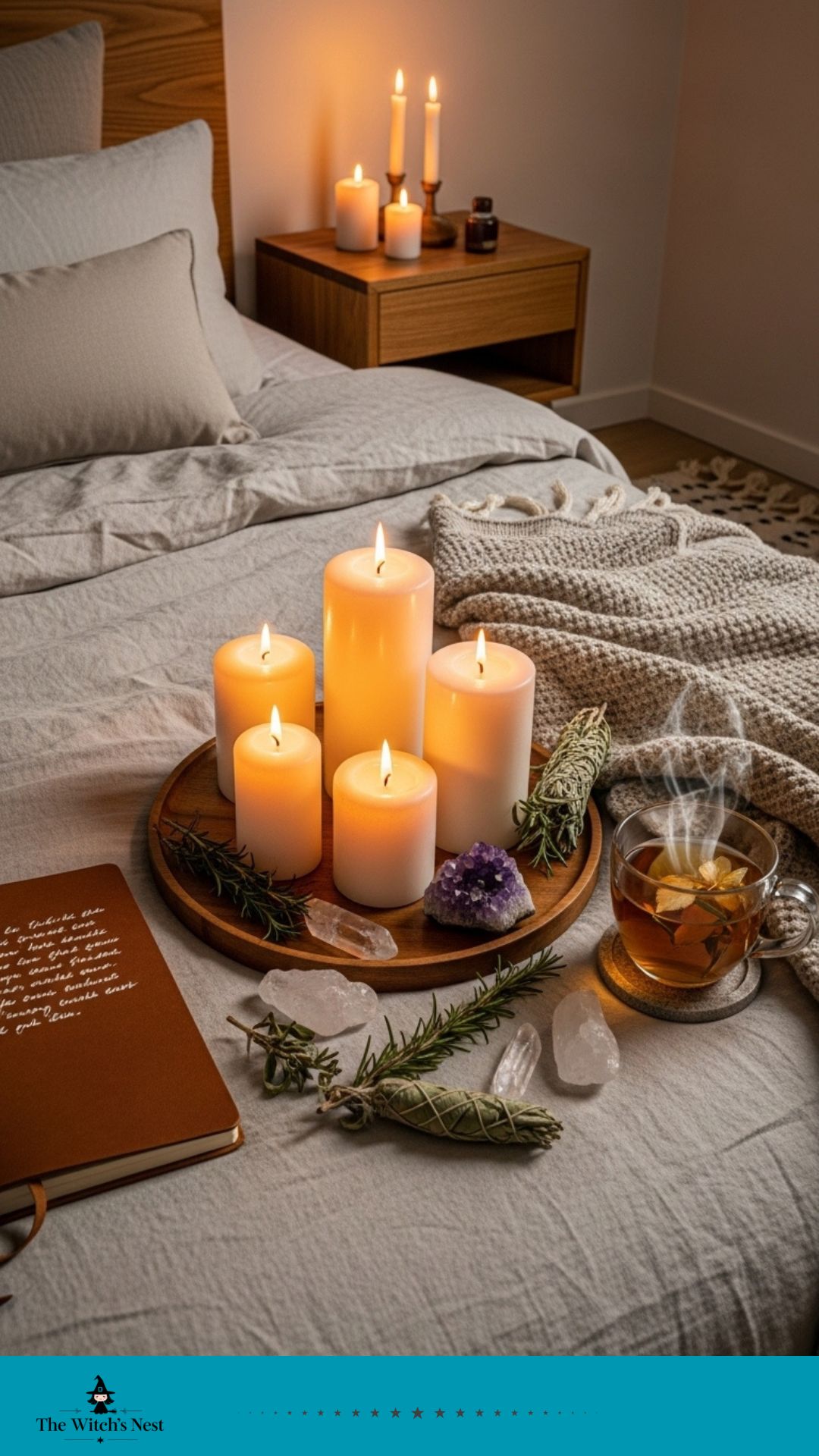 Use dried branches, pinecones, cinnamon sticks, rosemary, feathers, or even crystals. Think nature meets ritual.Add candles—lots of them
