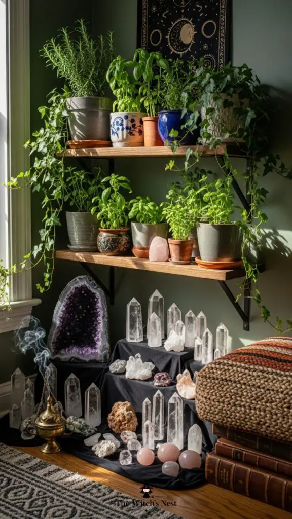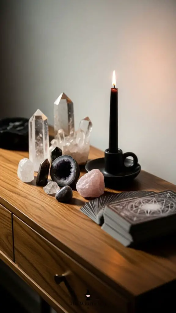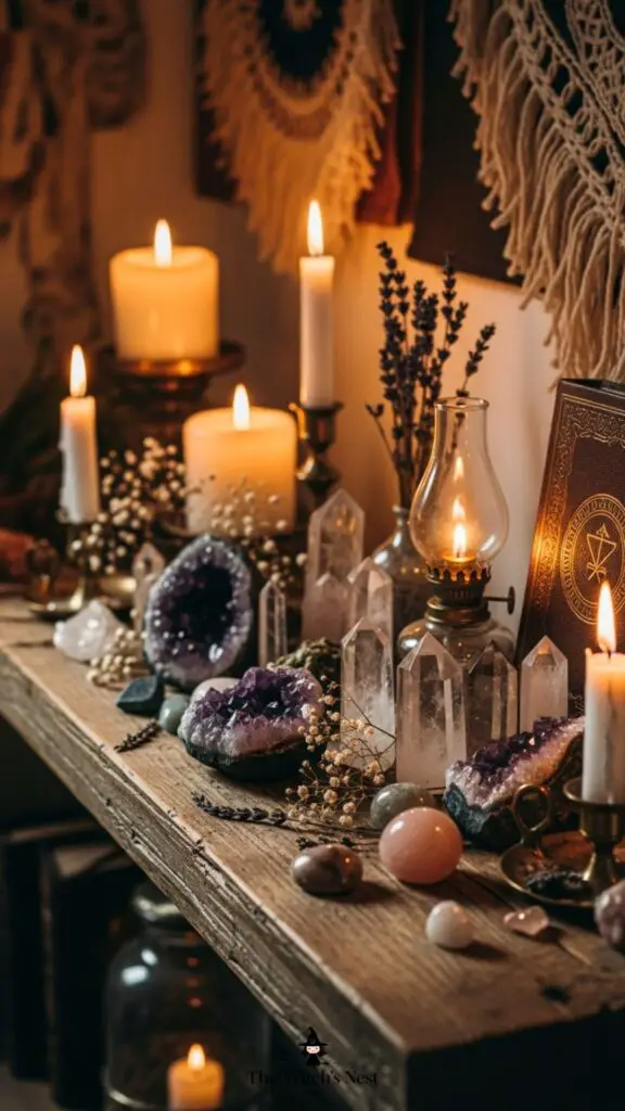 Dedicate a small corner to an altar where you can place crystals, tarot cards, herbs, and candles. It becomes a personal spiritual center within your home.