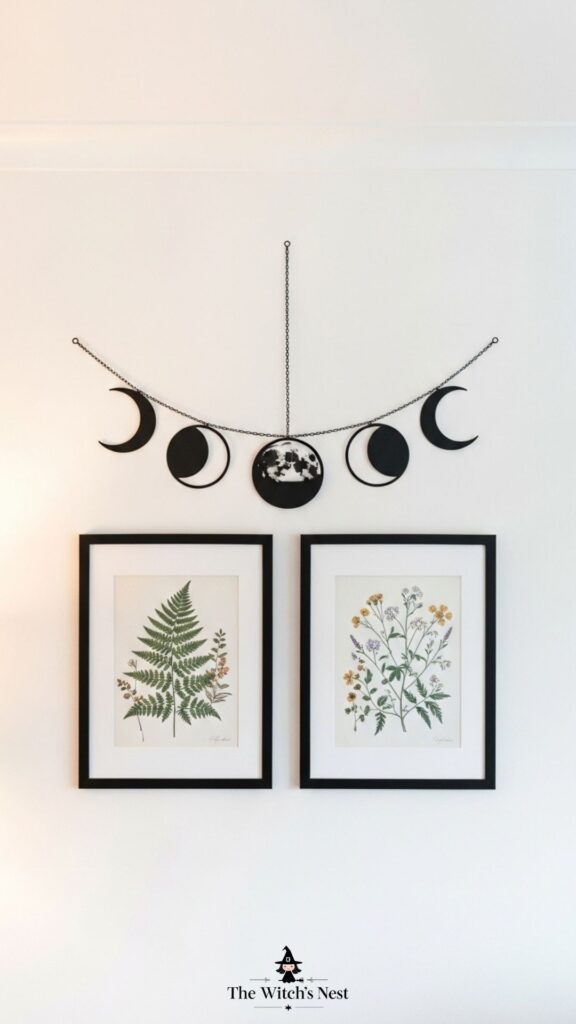 Hang moon phase garlands, botanical prints, or witchy tapestries to bring magical energy to your walls. It’s an easy way to shift the vibe instantly.