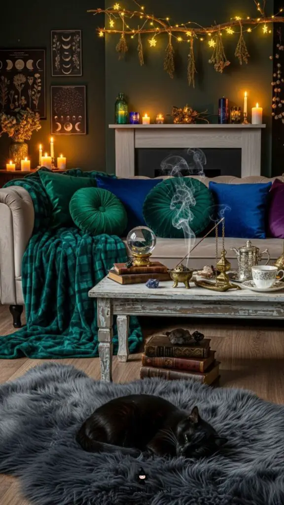 Mix velvet pillows, plaid throws, and faux fur rugs. Witchy homes should feel like a warm sanctuary where you can rest, read, or cast spells in comfort.